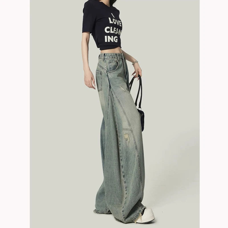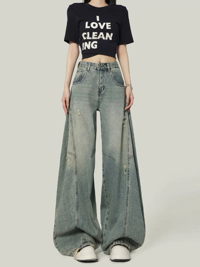 American High Street Retro Women Jeans Simple Basic High Waist Slim Woman Jeans Holes Casual Loose Chic Wide Leg Pants Female