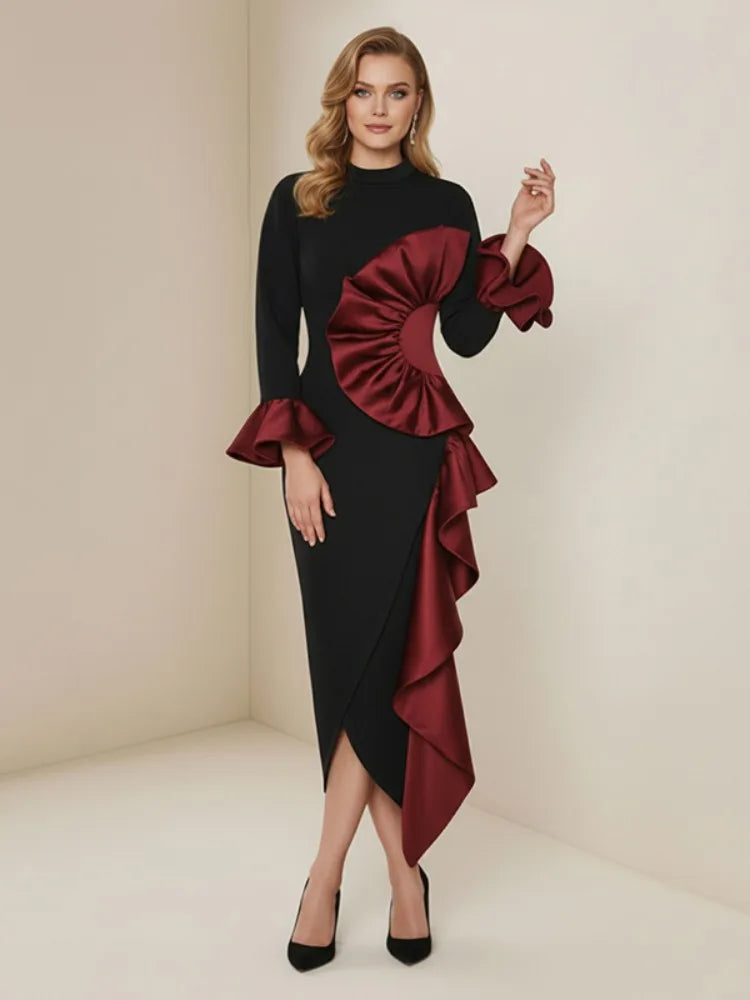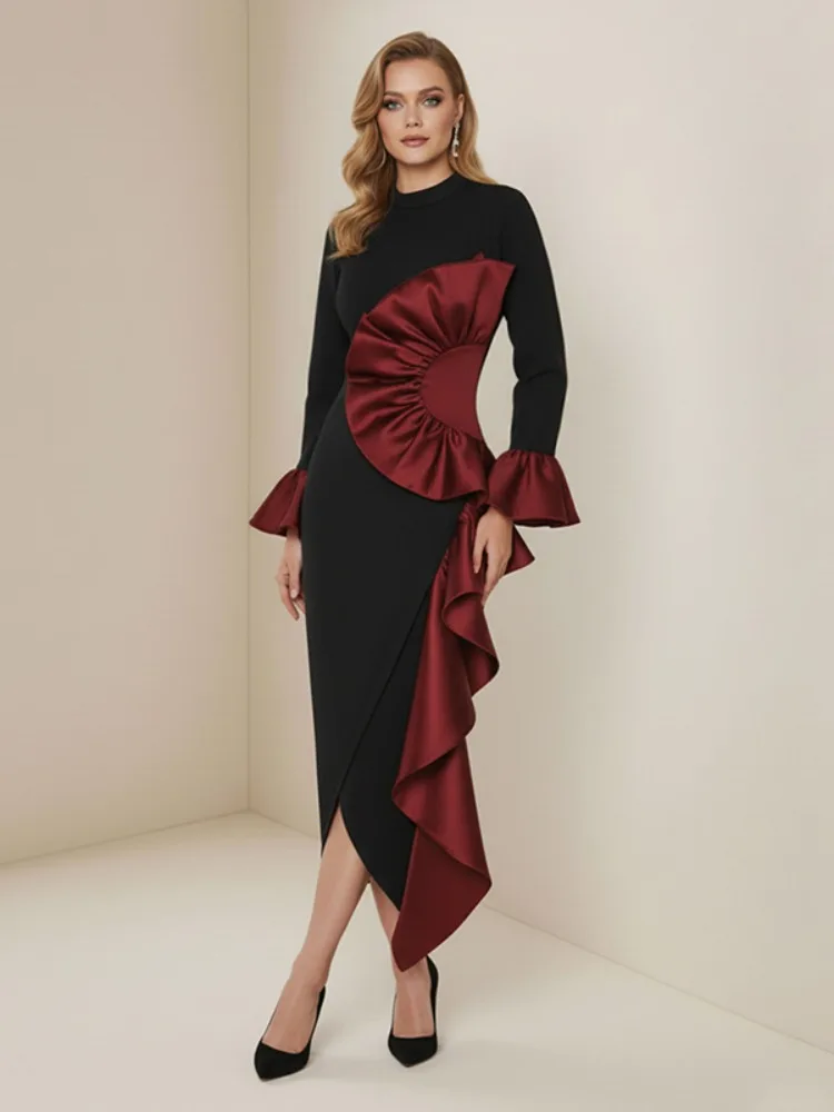 Freeacy Women's Black Red Ruffled Dress High Neck Long Sleeves High Waist Slim Fit Midi Dress Female Elegant Evening Dresses