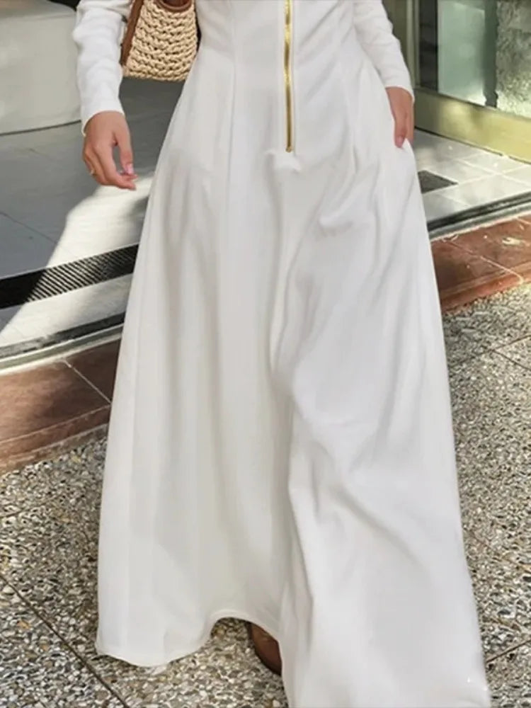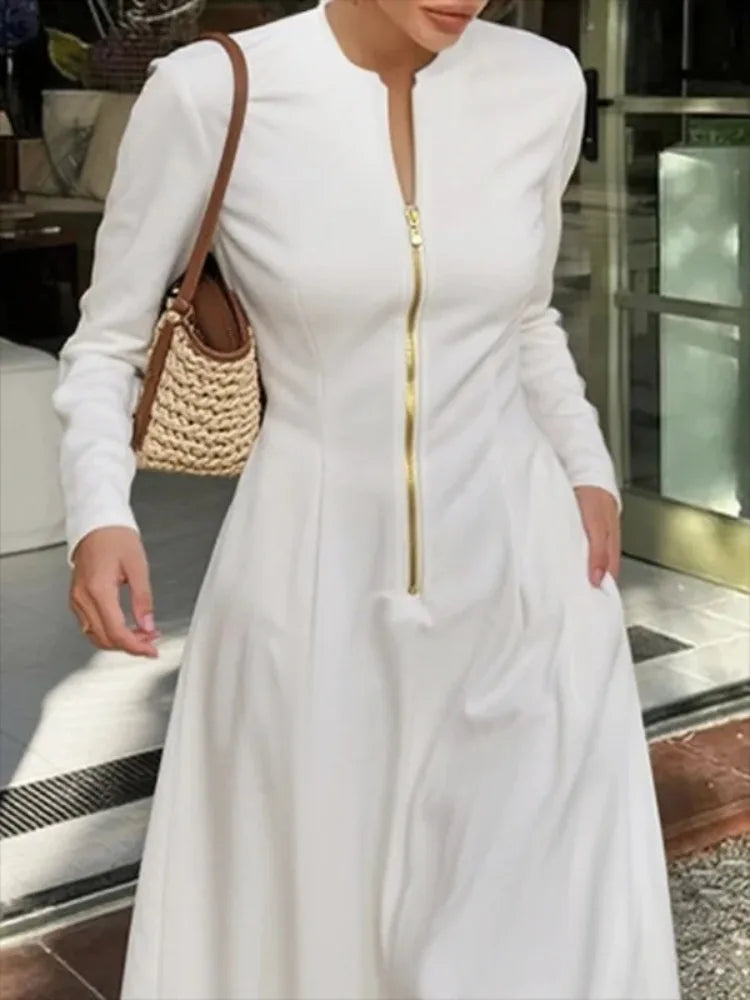 Women's Solid White Stand Collar Zip Front Waisted Long Sleeve Maxi Dress 2026 Spring Fashion Elegant Office Work Dresses