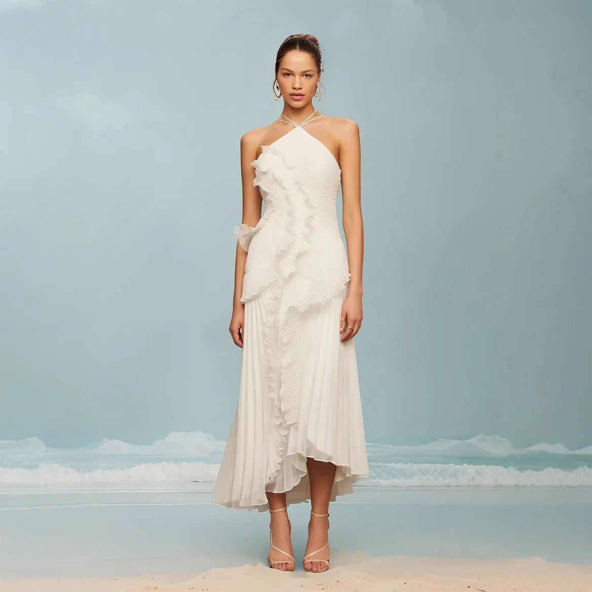 Women's summer high-end halter sleeveless irregular lace slit dress