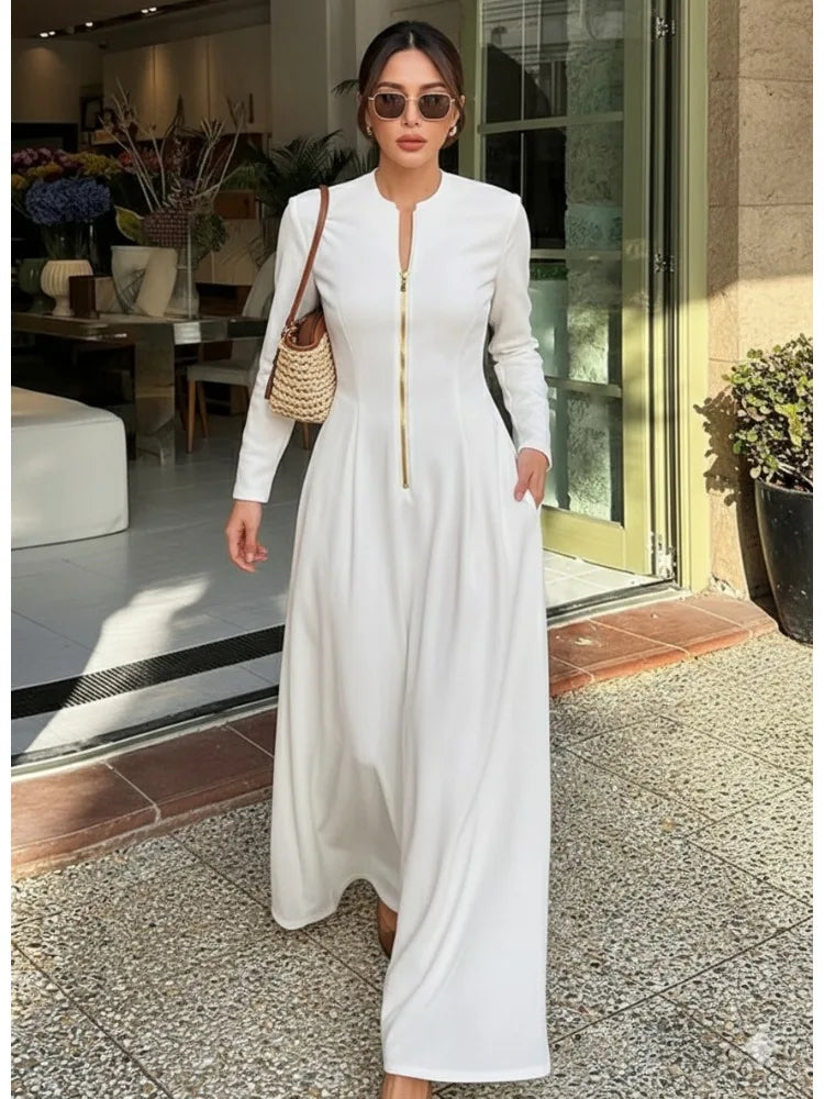 Women's Solid White Stand Collar Zip Front Waisted Long Sleeve Maxi Dress 2026 Spring Fashion Elegant Office Work Dresses