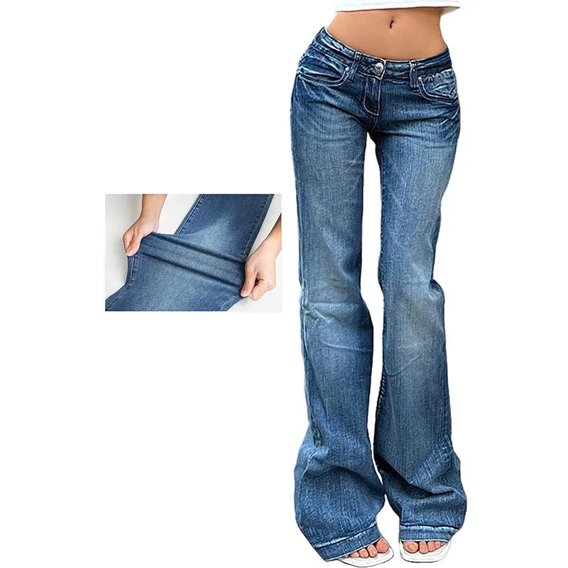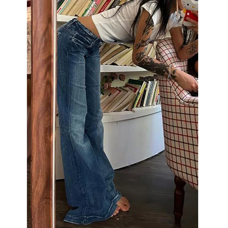 Y2K Vintage Flare Jeans for Women Sexy Low Rise Slim Fit Stretch Washed Denim Pants Harajuku Streetwear Wide Leg Jean Trousers